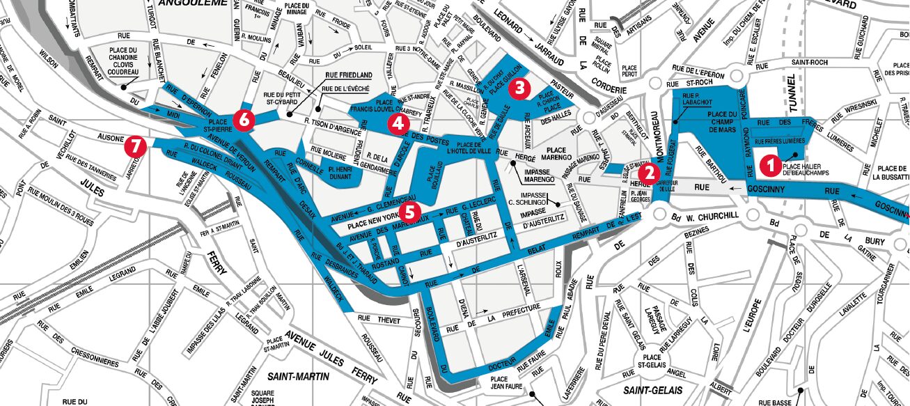 • Du samedi 9h30 au dimanche à minuit, circulation et stationnement interdits. - PLACE NEW YORK, PLACE BOUILLAUD, AVENUE CLÉMENCEAUX, PLACE DES HALLES, AVENUE DU GÉNÉRAL DE GAULLE, RUE DE L’ARSENAL, RUE GÉNÉRAL LECLERC, AVENUE DES MARÉCHAUX, RUE CARNOT, REMPART DESAIX, RUE LOUIS DES BRANDES, RUE WALDECK ROUSSEAU, REMPART DU MIDI, RUE DU MINAGE, RUE D’ÉPERNON : Du jeudi 6h au dimanche à minuit : fortes perturbations sur le stationnement et la circulation, mais également pour les piétons. Certaines zones ne sont pas accessibles aux riverains librement, se rapprocher des organisateurs pour condition d’accès : 05 45 94 31 90.