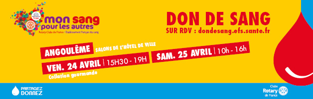 Les 24 et 25 avril, l’Hôtel de Ville d’Angoulême accueillera l’événement solidaire « Mon Sang Pour Les Autres », organisé par l’Établissement français du sang en partenariat avec les Clubs Rotary. Près de 300 donneurs sont attendus dans les salons de l’Hôtel de Ville pour participer à cette collecte exceptionnelle, placée sous le signe du partage et de la convivialité. Collation gourmande, accueil personnalisé et animations viendront remercier les donneurs pour leur engagement. Cette mobilisation est essentielle pour reconstituer les réserves avant les ponts de mai et répondre aux besoins constants des patients.
